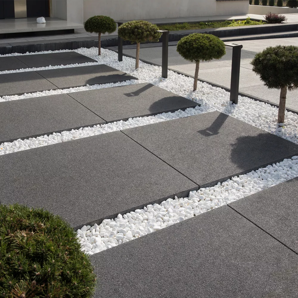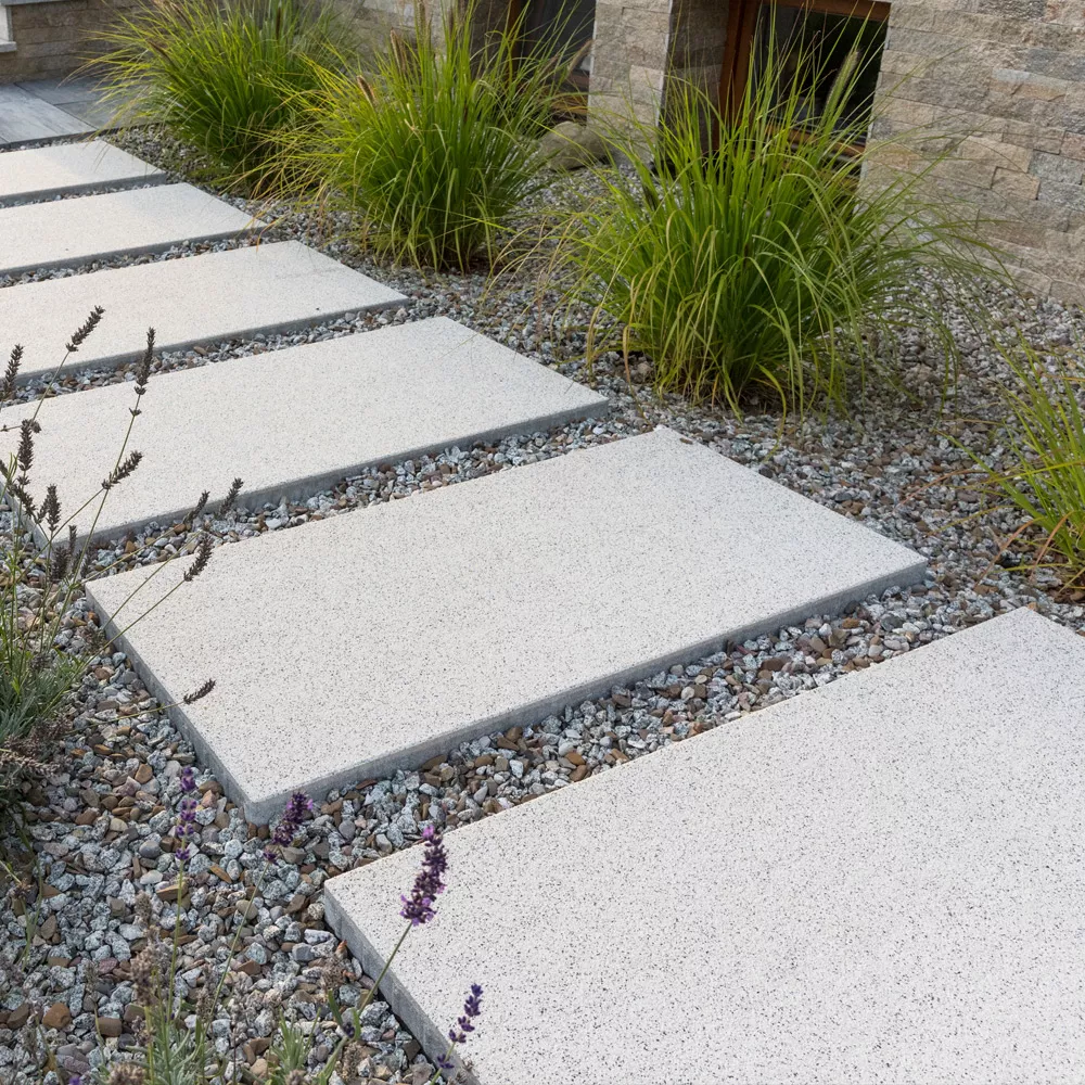 RUSTICAL obróbka poprzez śrutowanie ukazuje piękno częściowo odkrytych drobnoziarnistych kruszywek szlachetnych. Powierzchnie posiadają naturalną kolorystykę oraz drobną, lekko chropowatą teksturę. W porównaniu do powierzchni płukanych są bardziej lite, znacznie